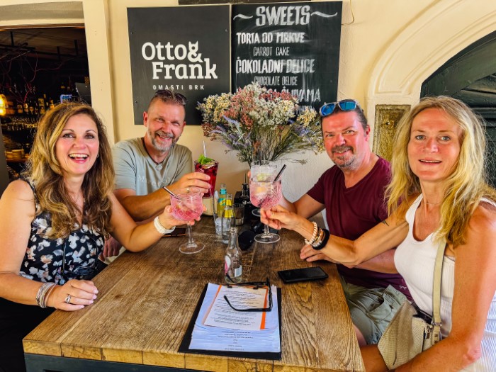 Mittags trafen wir uns mit Andrejas Vater und seiner Lebensgefährtin Inga im Restaurant Vinkl zum Mittagessen. Zum vorzüglichen Essen tranken Andreja und ich einen ausgezeichneten Rosé-Wein, und zum Schluss gab es noch ein Schnäpschen. Sven entschied sich für einen Sljivovica, Britti für einen Grappa und ich für eine Rogacica (Johannisbrotschnaps). Den Abend verbrachten wir auf Papas Terrasse, und am nächsten Morgen fuhren wir dann zu den Plitvicer Seen.