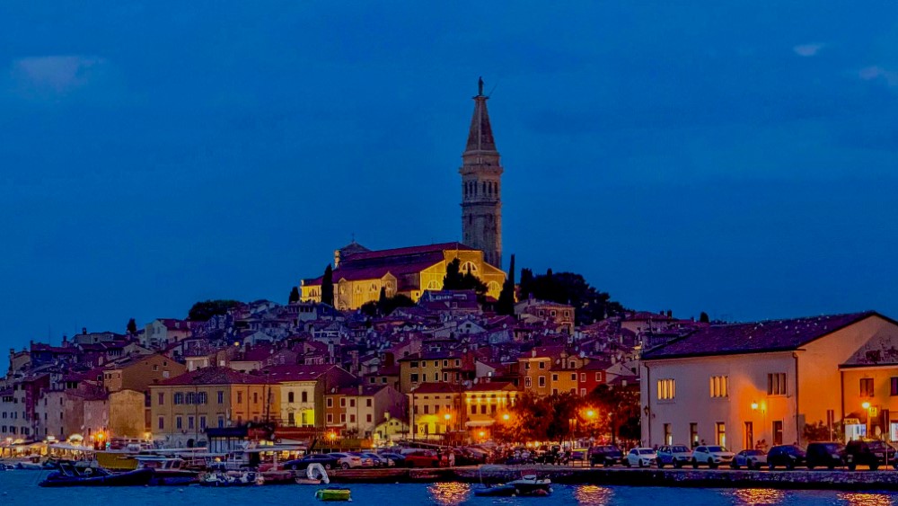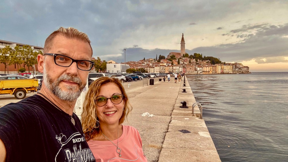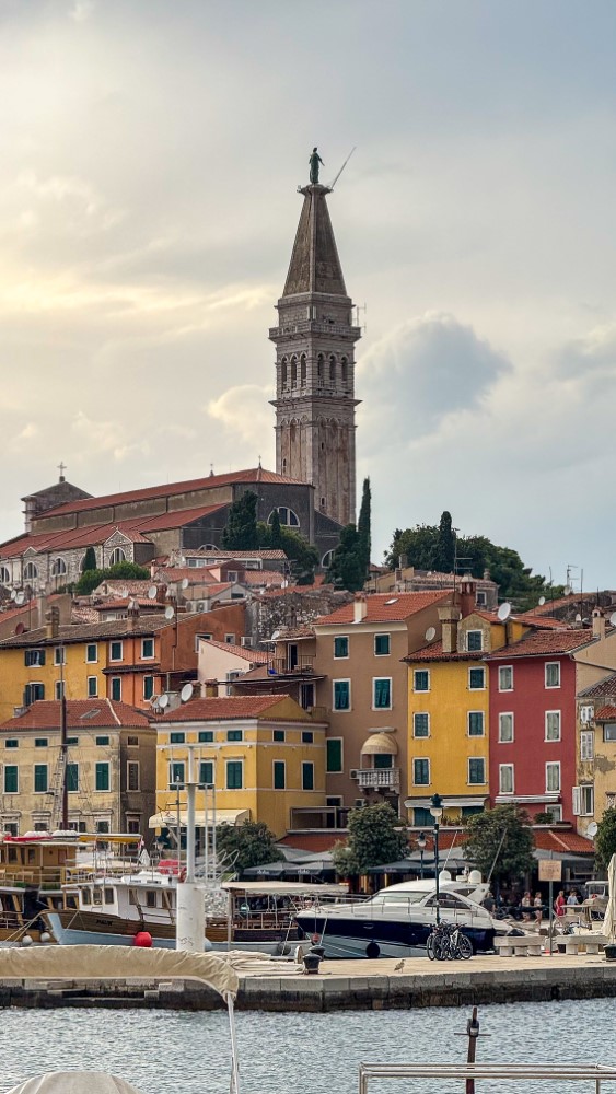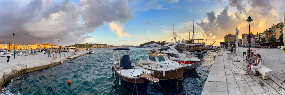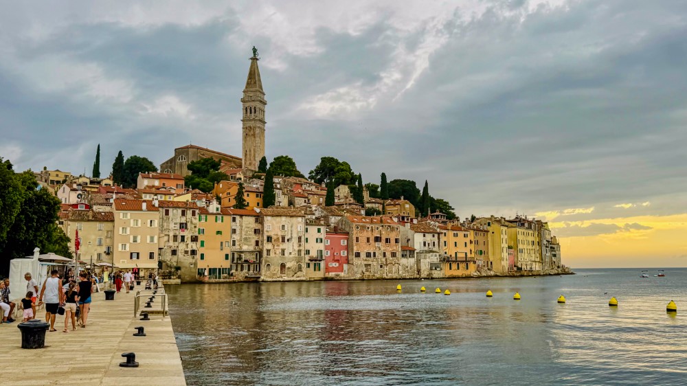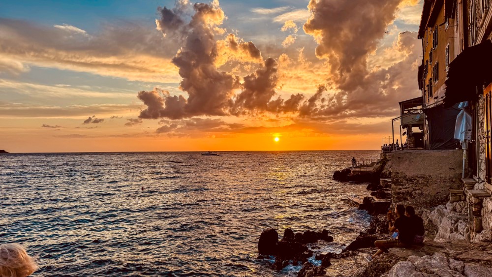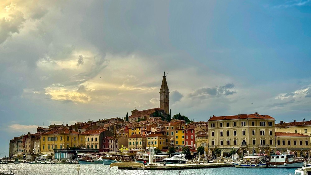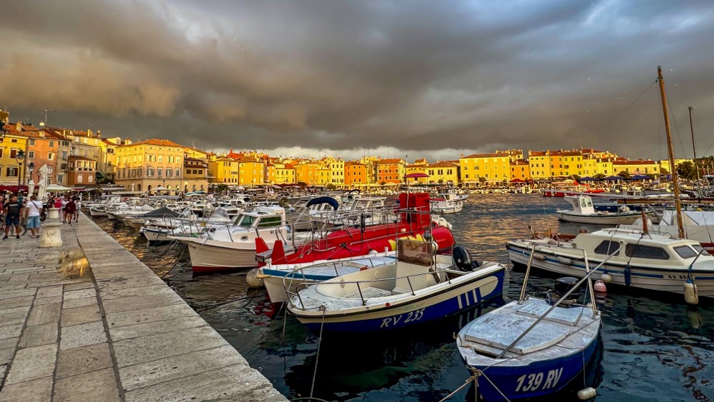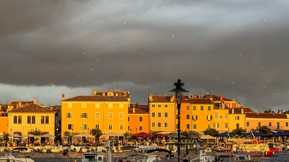 Am Nachmittag fuhren wir gemeinsam erneut nach Rovinj – diesmal von der anderen Seite der Altstadt. Plötzlich verdunkelte sich der Himmel und es sah nach Unwetter aus, während die Sonne gleichzeitig die Stadt in goldenes Licht tauchte 🌦️. Zum Glück zog der Regen vorbei, und wir wurden mit einem traumhaften Sonnenuntergang belohnt 🌅.