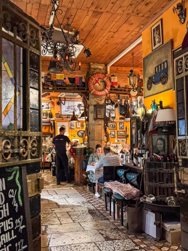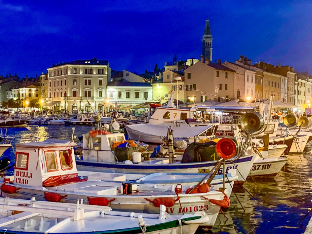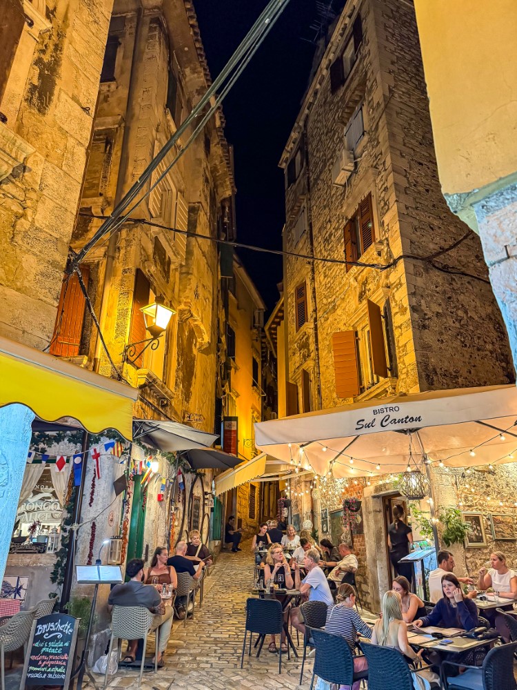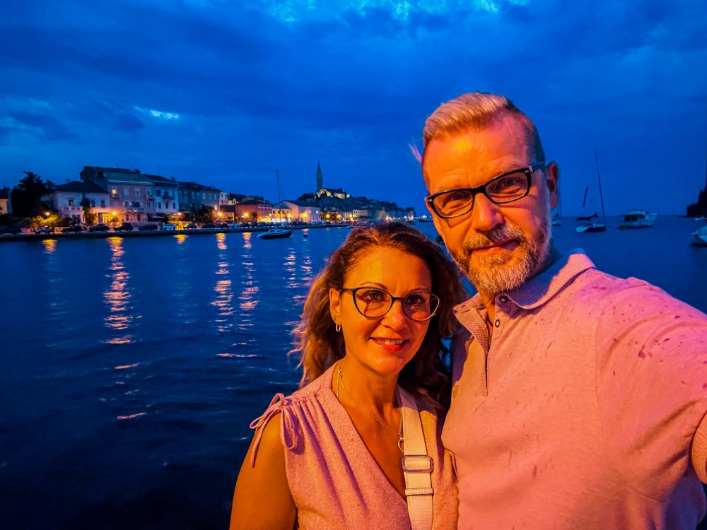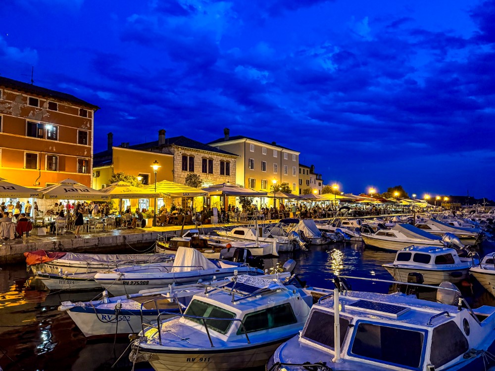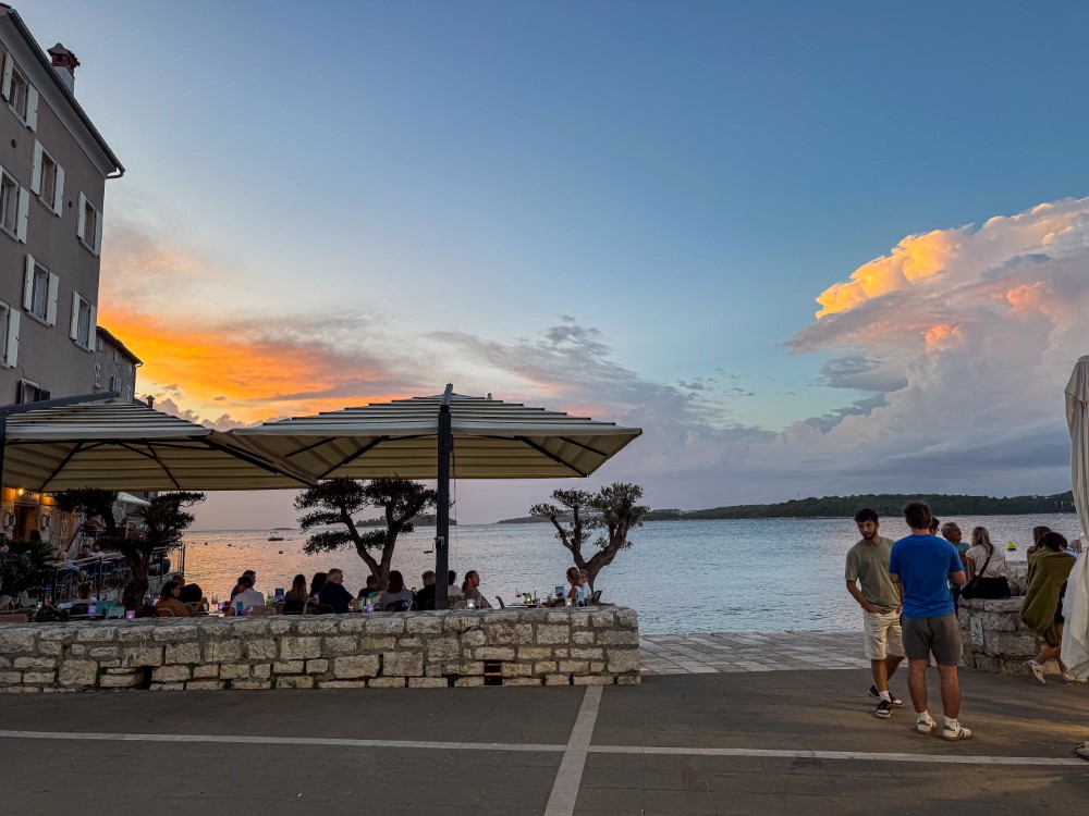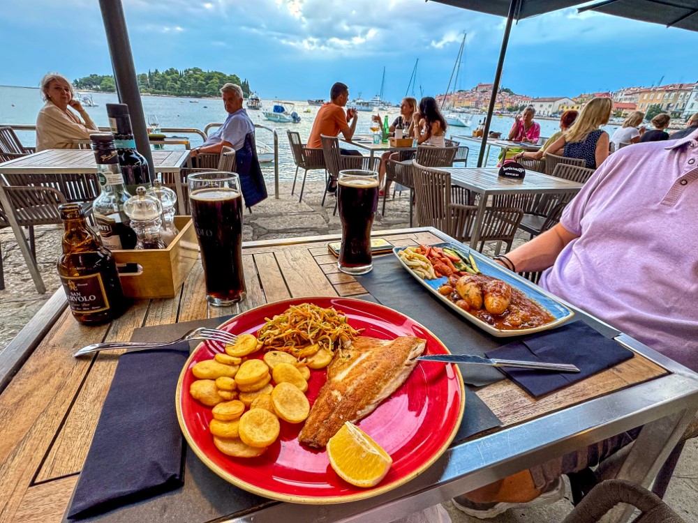 Noch am selben Abend radelten wir nach Rovinj. Der Hunger führte uns direkt ins Restaurant Maestral in der Marina, empfohlen von unseren Freunden Charlie & Sandra – und sie hatten recht: das Essen war fantastisch! Andreja bestellte Fisch 🐟, ich entschied mich für gefüllte Tintenfische 🦑, die perfekt zubereitet waren.