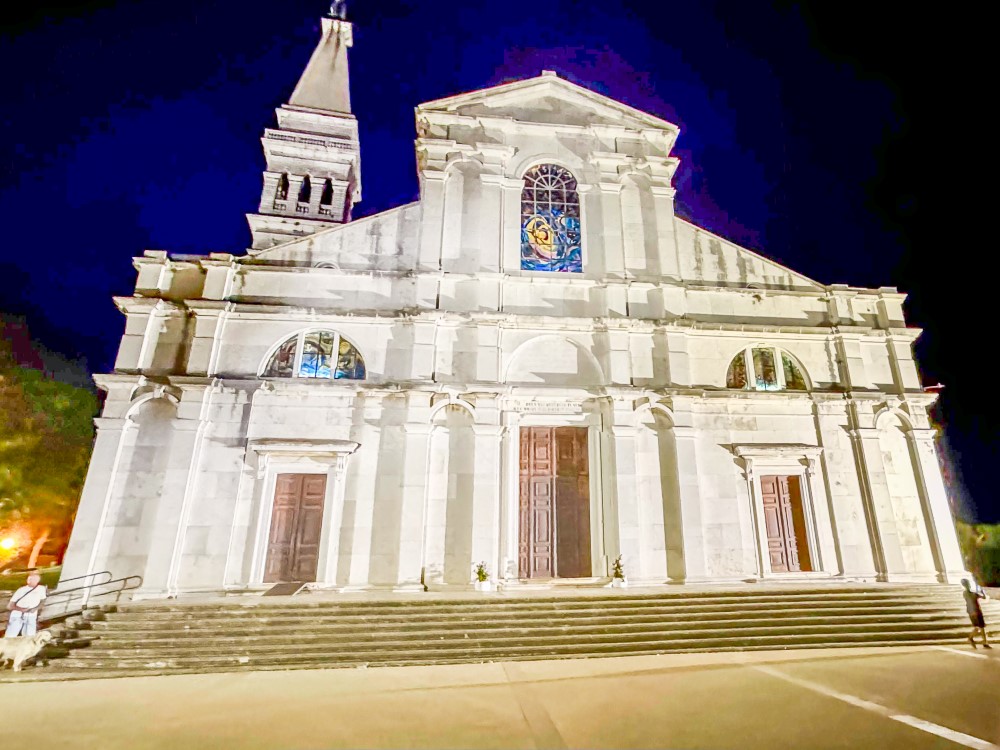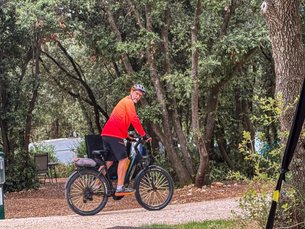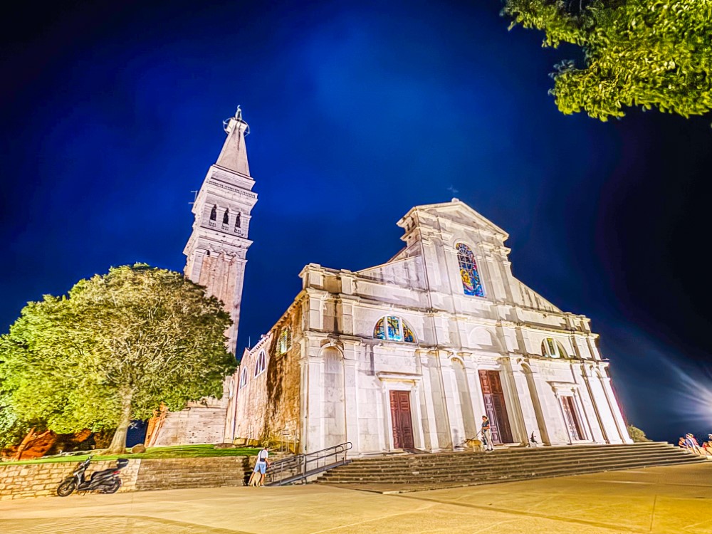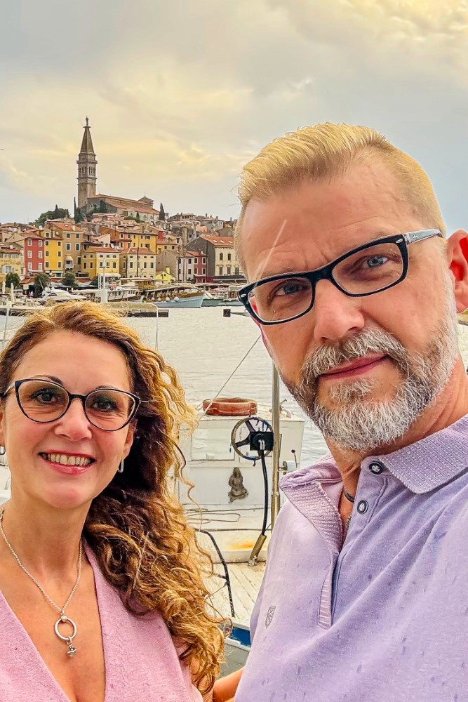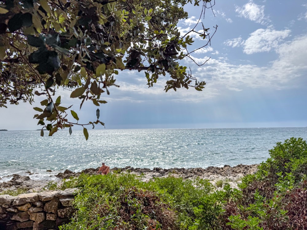 Gestärkt spazierten wir anschließend in die Altstadt. Durch enge, lebhafte Gassen ging es hinauf zur Kirche der heiligen Euphemia ⛪, von wo aus man einen wunderbaren Blick über die Stadt hat. Beim Abstieg lockten die vielen kleinen Cafés – im Batana Café gönnten wir uns noch ein süßes Highlight: Andreja die legendäre Torte 7 Sünden 🍰 und ich ein Stück Griechische Torte. Dazu ein Cappuccino, und dann radelten wir glücklich zurück zum Campingplatz.